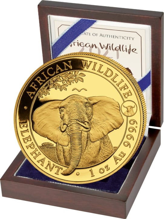 Investieren Sie in die 1 Unze Gold Somalia Elefant 2021 Privymark Ochse und sichern Sie sich ein Stück Geschichte, ein Kunstwerk und eine kluge Investition in einem.