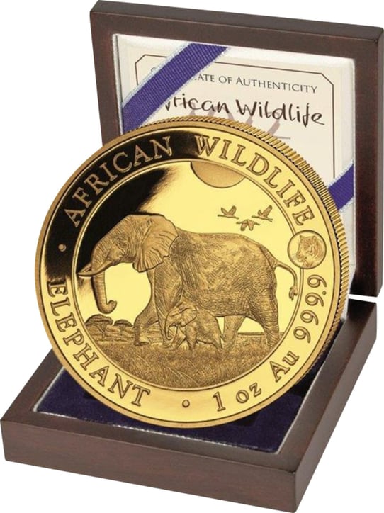 Die Vorderseite der Goldmünze zeigt einen erwachsenen Elefanten in der Wüste Somalias. Vor ihm schreitet ein kleiner Elefant. Über den beiden Dickhäutern fliegen drei Vögel und begleiten sie auf ihrer Reise mit unbekanntem Ziel. Das besonders realistisch anmutende Motiv wird von den Schriftzügen „AFRICAN WILDLIFE“, „ELEPHANT“, „1 oz Au 9999.“ und dem kreisrunden Motivsymbol des Privymark Tigers umrandet. Auf der Rückseite finden sich neben dem Wappen Somalias der passende Länderschriftzug, sowie das Prägejahr 2022 und der Nennwert in Höhe von „1.000 SHILLINGS“.