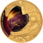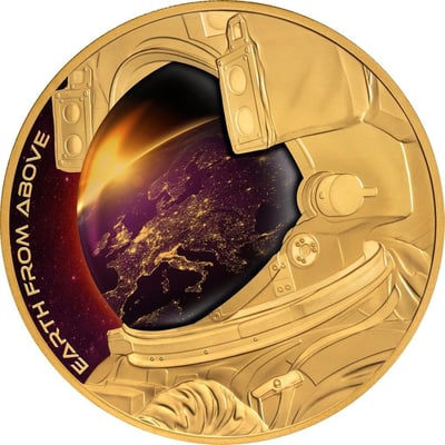 Sonnenuntergänge sind etwas Wunderschönes. Stellen Sie sich einmal vor, Sie hätten die Möglichkeit, einen Sonnenuntergang vom Weltraum aus zu beobachten. Diese fantastische Gelegenheit hat der Astronaut bekommen, der auf der Vorderseite dieser Goldmünze eingeprägt ist. In seinem Astronautenhelm ist die Erde aus dem Blickwinkel des Astronauten zu sehen. Besonders auffallend ist der europäische Kontinent.