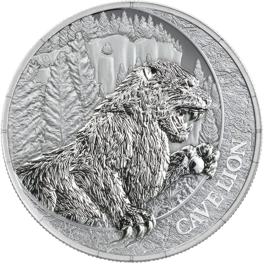 Die Rückseite dieser streng limitierten Münze zeigt den Cave Lion in einem Moment purer, ungezähmter Kraft. Mit geöffnetem Maul, ausgefahrenen Krallen und einem Körper, der zum Angriff bereit scheint, verkörpert das Motiv die rohe Dominanz dieses prähistorischen Jägers. Die umgebende Landschaft – schroffe Klippen und dichter Nadelwald – vermittelt eindrucksvoll die Härte der Eiszeit. Jedes einzelne Haar des mächtigen Fells wurde mit akribischer Präzision herausgearbeitet.