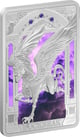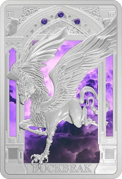 Die Silbermünze ist aus einer Unze 99,9% Silber in der höchst möglichen Prägequalität „Polierte Platte“ (PP) geprägt und zeigt eine detailreiche Darstellung des stolzen und treuen Hippogreifs Buckbeak. Der Hintergrund ist in symbolischen Violetttönen gehalten, die den majestätischen Charakter des Hippogreifs unterstreichen. Die Rückseite der Münze präsentiert das Wappen von Niue, das Prägejahr 2023 und den Nennwert von zwei Niue-Dollar.