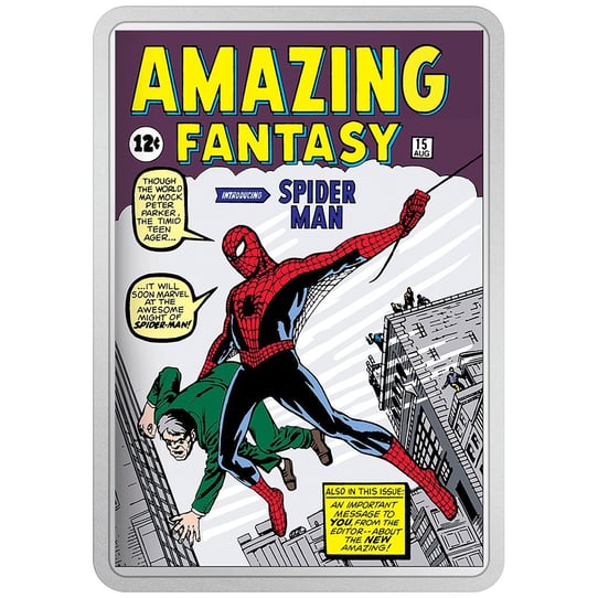 Die 2 Unze Silber Marvel Amazing Fantasy Comix 2023 verzaubert mit ihrem außergewöhnlichen Motiv. Auf der Vorderseite ist der weltbekannte Superheld Spiderman zu sehen, wie er über die Dächer der Stadt schwingt. Dieses spektakuläre Motiv ist ein Muss für jeden Comic-Fan und macht diese Münze zu einem begehrten Sammlerstück. Auf der Rückseite der Münze ist das Staatswappen von Niue abgebildet, was die Münze zu einem offiziellen Zahlungsmittel macht.