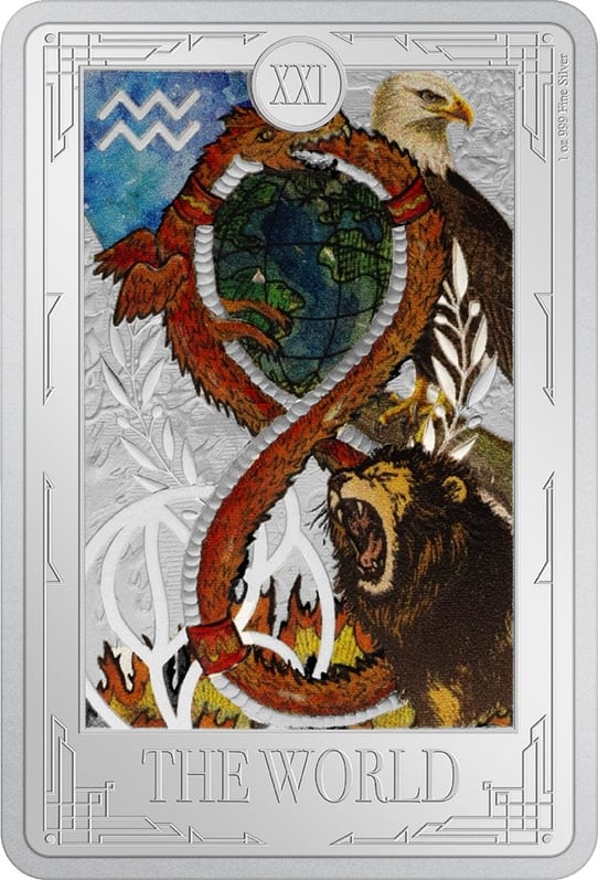 Jede dieser exklusiven Silbermünzen wird in einem edlen Etui mit Echtheitszertifikat ausgeliefert. Die Münze trägt einen Nennwert von 2 Niue-Dollar und wurde von der New Zealand Mint im Auftrag des Pazifikstaates Niue geprägt. Die Rückseite ziert das offizielle Wappen von Niue, während die Vorderseite die kunstvoll colorierte Darstellung der Tarotkarte "Die Welt" zeigt.