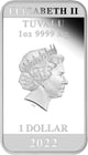 Die Wertseite der Münze ist mit dem Bildnis der britischen Queen Elizabeth II geprägt sowie mit dem Prägejahr des Produktes (2022), dem Nennwert (1 Tuvalu-Dollar), der Stückelung (1 Unze) sowie mit der Feinheit (999,9).