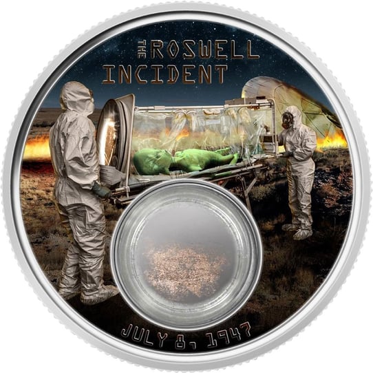 Noch heute wird heftig darüber diskutiert, was damals tatsächlich passiert ist. Es gibt unzählige Theorien und Berichte, unter anderem darüber, dass nicht nur ein UFO, sondern sogar Aliens gefunden wurden, die bei dem Absturz ums Leben kamen. Auf dem Motiv dieser Münze wird dargestellt, wie zwei Wissenschaftler in Anzügen den leblosen Körper eines Aliens wegtransportieren.