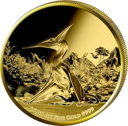 Besonders bemerkenswert: Die kunstvolle Gestaltung nutzt die glänzende Goldoberfläche perfekt aus. Durch den Kontrast zwischen polierten und mattierten Bereichen entsteht eine dreidimensionale Wirkung, die den Pteranodon förmlich aus der Münze hervortreten lässt.