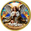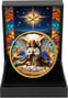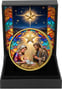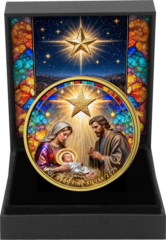 Das Motiv zeigt die Heilige Familie in einer Darstellung von atemberaubender Schönheit. Maria und Josef, liebevoll über das Jesuskind gebeugt, werden von einem strahlenden, teilvergoldeten Stern überstrahlt. Die farbenprächtigen Glasfenster-Elemente rahmen die Szene ein und verleihen ihr eine sakrale Atmosphäre. Besonders beeindruckend: Die Teilvergoldung des Sterns lässt ihn förmlich aus der Münzoberfläche hervortreten und verleiht ihm eine dreidimensionale Wirkung.